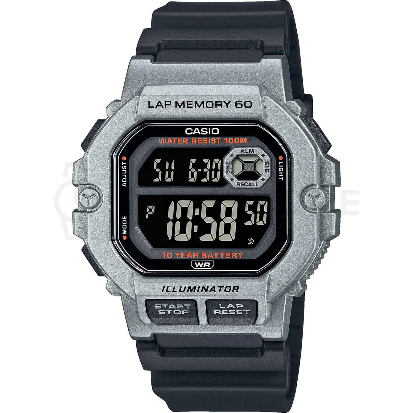 - calendario automático, Alarma, Cronómetro con cuenta atrás, Iluminación, Indicador de días de la semana